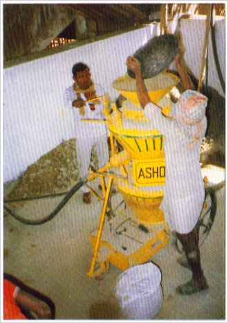 | GUNITE is a process by which Plastering is sprayed at a high velocity. It is defined as mortar consisting of Cement and Sand, conveyed from the delivery equipment known as Gun through a hose and Pneumatically Forced through a nozzle where water is added at a high velocity onto a surface. The Force of the jet impacting on the surface compacts the material. A comparatively dry mix is gererally used so that the material is caplable of supporting itselg without sagging for vertical and overhead applications. |
